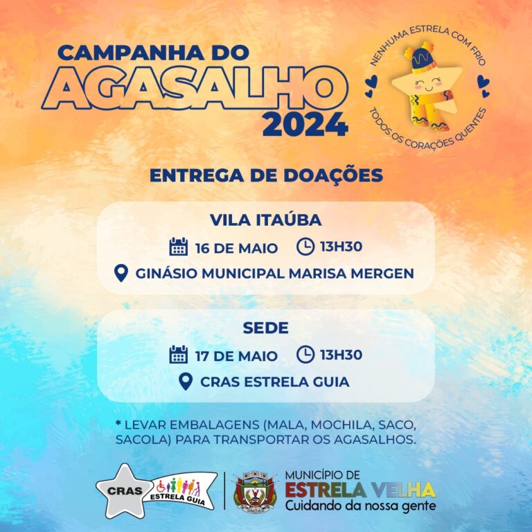 A entrega das doações da Campanha do Agasalho 2024 realizada pela Secretaria Municipal de Assistência Social, Cultura e Turismo acontecerá na próxima semana. Serão dois momentos de entrega: na quinta-feira, 16 de maio, em Vila Itaúba, e na sexta-feira, 17 de maio, no CRAS Estrela Guia. Os interessados devem comparecer com embalagens adequadas (mala, mochila, saco, sacola) para transporte das doações recebidas.