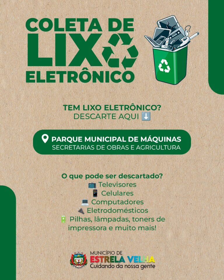 Integrando a Semana do Meio Ambiente, a Administração Municipal de Estrela Velha, por meio do Departamento de Meio Ambiente, está intensificando a coleta de lixo eletrônico. O município conta com um ponto permanente de coleta, localizado no Parque de Máquinas, nas dependências da secretaria de Obras e Agricultura.