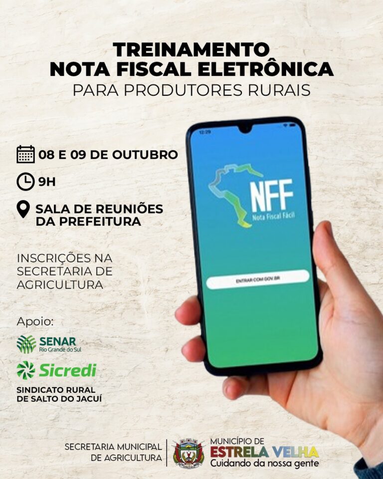 A Prefeitura de Estrela Velha, por meio da Secretaria Municipal de Agricultura, promoverá um novo treinamento gratuito voltado aos produtores rurais sobre a emissão da Nota Fiscal de Produtor Eletrônica (NFP-e). A capacitação ocorre nos dias 8 e 9 de outubro, a partir das 9h, na Sala de Reuniões da Prefeitura, com vagas limitadas a 15 participantes.