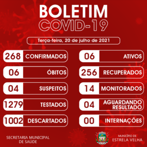 A Secretaria Municipal de Saúde de estrela Velha confirmou, na tarde dessa terça-feira, 20, o registro de um novo caso de coronavírus em. Trata-se de uma mulher de 64 anos. Segundo o boletim epidemiológico, desde o início da pandemia, o município registra 268 casos confirmados de Covid-19. Desses, 256 já estão recuperados.