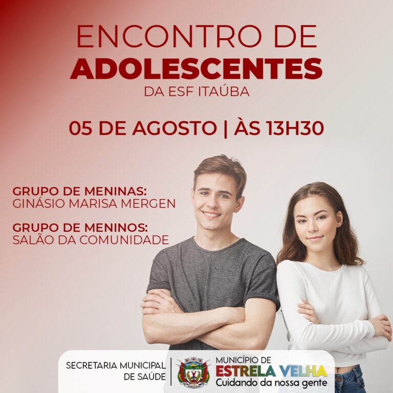 A Secretaria Municipal de Saúde de Estrela Velha vai promover um encontro com adolescentes, entre 12 e 18 anos, que integram a área de abrangência da ESF de Vila Itaúba. O evento será nesta sexta-feira, 05, a partir das 13 horas e 30 minutos, organizado em dois grupos. O grupo de meninas será conduzido pela enfermeira, Francielli Schanne, no Ginásio Municipal Marisa Ravanello Mergen. Já o grupo de meninos, será conduzido pelo médico, João Kischener, pelo psicólogo, Rodrigo Terras, e pelo farmacêutico, Humberto Bentlin.