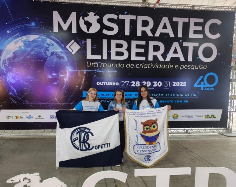 A Escola Estadual Padre Benjamim Copetti, representada pelas estudantes do Curso Normal, está participando da Mostratec em Novo Hamburgo, com o Projeto Brincar é Coisa Séria: estimulando o cérebro sem telas e com sustentabilidade. O evento iniciou na última segunda-feira (27) e vai até esta sexta, dia 31 de outubro. Este projeto foi elaborado pelas turmas 301 e 201 do Curso Normal com as professoras orientadoras Catiléia Ferraz Dreher e Maria Ivone Herath Vendruscollo, com o objetivo de sensibilizar sobre o excesso de telas na infância, incentivando as famílias a construírem junto com as crianças, brinquedos simples e criativos, estreitando vínculos afetivos e aprendizagens.