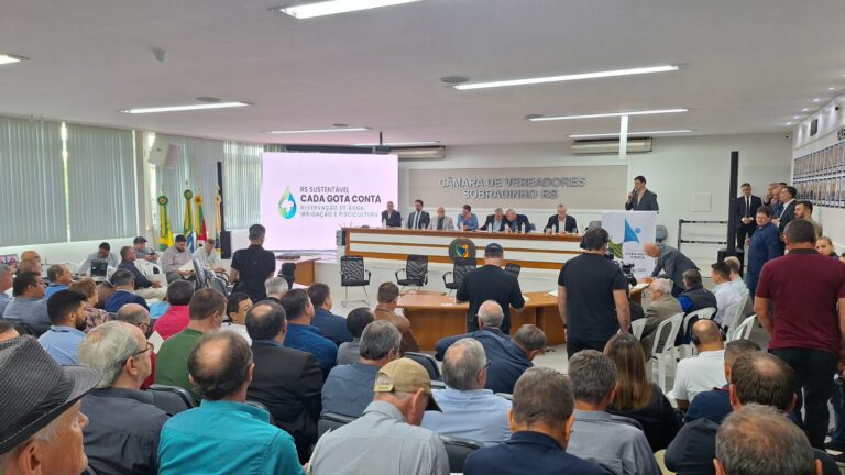 Técnicos da área agropecuária, lideranças políticas e representantes de diversas entidades participam. na Cãmara de Vereadores de Sobradinho, do encontro inaugural do projeto ‘RS Sustentável: Cada Gota Conta’, série de painéis que vai debater ideias e propostas sobre reservação de água, irrigação e piscicultura. Este é o tema central da gestão 2024-2025 da Assembleia Legislativa, sob a liderança do presidente Adolfo Brito (PP), que fez a abertura do evento, pouco depois das 09 horas da manhã.