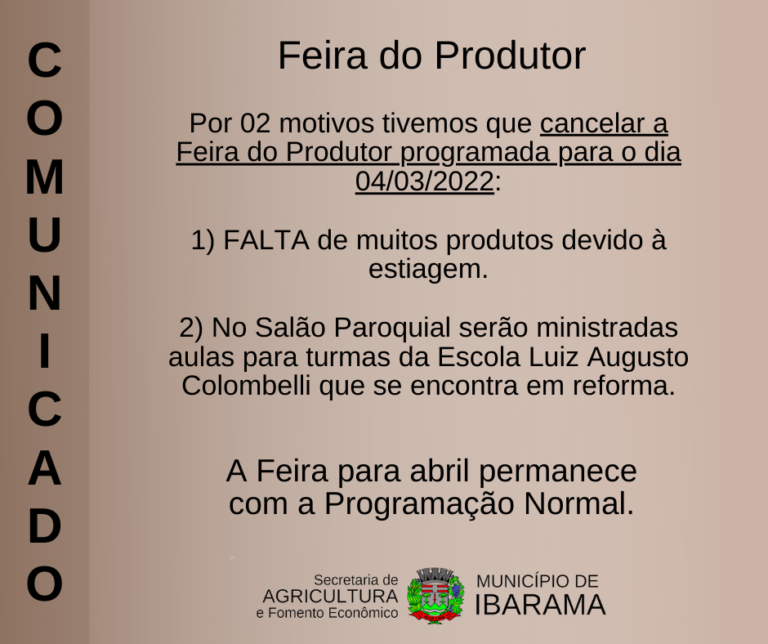 Além disso, o Salão Paroquial estará cedido para aulas das turmas da Escola Municipal Luiz Augusto Colombelli, que atualmente encontra-se em reforma. A prefeitura destaca que em abril, permanece a programação normal da Feira do Produtor de Ibarama.