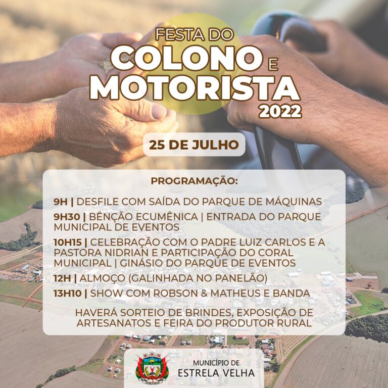 A Administração Municipal de Estrela Velha definiu a programação especial para a Festa do Colono e Motorista 2022, que ocorre na próxima segunda-feira, dia 25 de julho, no Parque Municipal de Eventos Oscar Leite de Moraes. Falando ao programa ENFOQUE da Rádio Sobradinho AM, na manhã desta quarta-feira (20), o prefeito Alexander de Castilhos, adiantou que às 9 horas, haverá desfile com saída do Parque de Máquinas. Às 9 horas e 30 minutos benção ecumênica no parque Municipal de Eventos. Às 10 horas e 15 minutos, celebração com o padre Luiz Carlos e com a pastora Nidrian, e participação do Coral Municipal de Estrela Velha, no ginásio do parque de eventos.