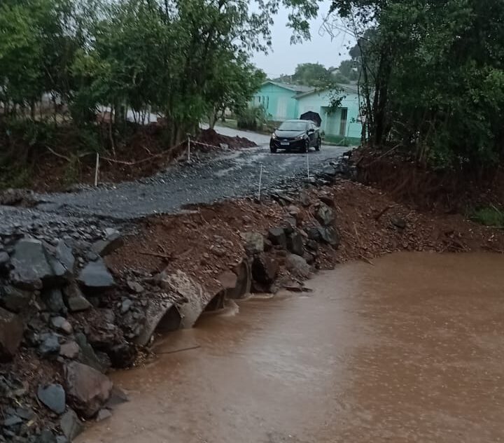 Conforme o secretário municipal de Obras, Paulo Dalmolin, os canos instalados no local deram vazão normal para a passagem da água. No entanto, como o aterro é novo, houve um desmoronamento da base compactada. A equipe de Obras aguarda condições melhores do tempo para fazer a recuperação do local e permitir novamente a passagem de veículos.