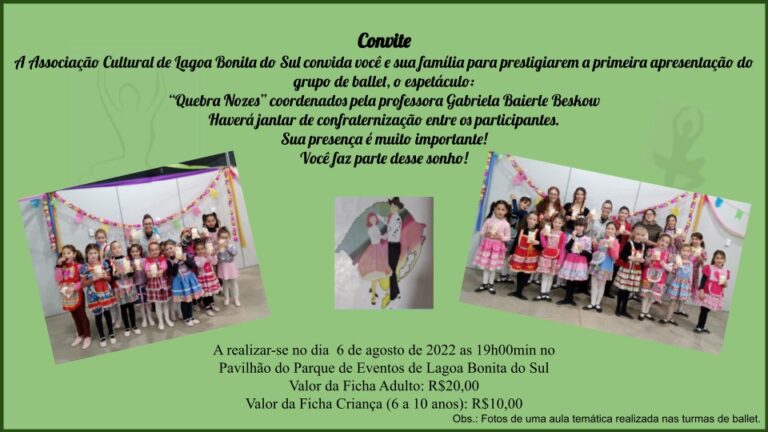 A Associação Cultural de Lagoa Bonita do Sul vai promover neste sábado, 06, a primeira apresentação de seu Grupo de Ballet, com o espetáculo “Quebra Nozes”. O evento, em parceria com a prefeitura, será no pavilhão do parque de eventos de Lagoa Bonita, a partir das 19 horas.