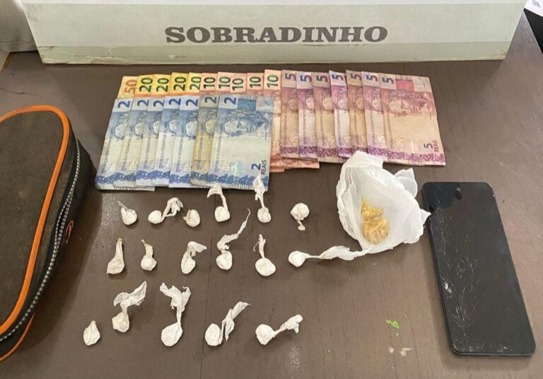 No local, os policiais encontraram 17 porções de cocaína (13g), uma pedra de crack (6,6g), um celular Motorola, R$ 229 em dinheiro e o estojo utilizado para guardar os entorpecentes. O suspeito recebeu voz de prisão e foi conduzido para avaliação médica e, em seguida, à Delegacia de Polícia Civil de Santa Cruz. Após os procedimentos, o homem foi encaminhado ao Presídio Estadual de Sobradinho. A ficha criminal do criminoso inclui antecedentes por tráfico de drogas, furtos, roubos, posse de arma, lesão corporal, entre outros crimes.