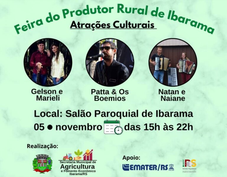 Além disso, haverá apresentações de artistas locais como Gelson e Marielli; Patta e Os Boêmios, e Natan e Naiane. A feira prossegue no sábado pela manhã encerrando ao meio dia. Falando ao programa Enfoque da Rádio Sobradinho AM, o prefeito Valmor Mattana disse que esta é a primeira edição da feira, de outras tantas que ocorrerão nos próximos meses. Conforme ele, a prefeitura aguarda a liberação de uma emenda parlamentar para a construção da futura Casa do Produtor e do Artesão de Ibarama, obra que vai proporcionar a realização de uma feira permanente no município.