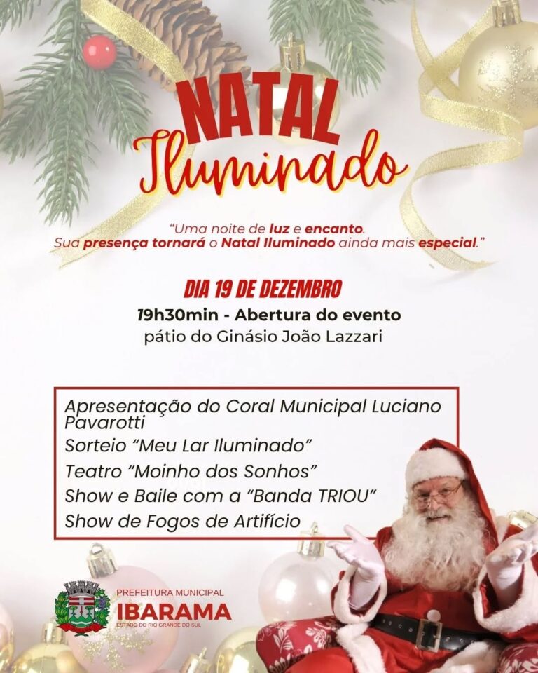 A agenda continua no dia 19 de dezembro, às 19h, com o espetáculo Natal Iluminado, trazendo atrações culturais e musicais para encantar as famílias no pátio do Ginásio João Lazzari. Encerrando o ciclo festivo, no dia 4 de janeiro de 2026, às 19h, será realizado o 4º Encontro de Terno de Reis de Ibarama, mantendo viva a tradição e fortalecendo a cultura local.