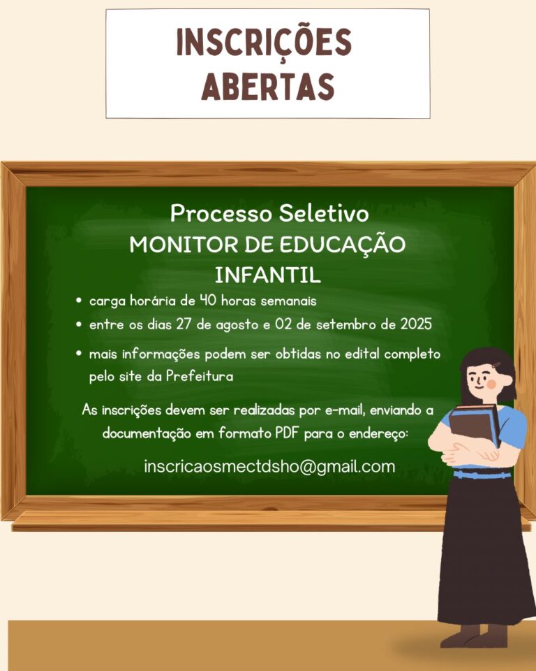 As inscrições do Processo Seletivo para Monitor de Educação Infantil na Rede Municipal de Ensino, com carga horária de 40 horas semanais, encerram nesta terça-feira (02). Conforme a Secretaria Municipal de Educação, Cultura, Turismo e Desporto, as inscrições devem ser feitas, exclusivamente, por meio de e-mail.
