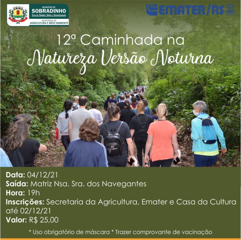 A saída está programada para às 19 horas, em frente à Igreja Matriz Nossa Senhora dos Navegantes percorrendo um trajeto de 8 quilômetros. Segundo os organizadores os participantes deverão levar lanternas. Além disso, haverá pontos de apoio aos caminhantes. Os interessados podem se inscrever até esta quinta-feira (02), às 17 horas, no Escritório Municipal da Emater, na Casa da Cultura ou na Secretaria da Agricultura de Sobradinho. No momento da inscrição será cobrada uma taxa de R$ 25,00. Estes recursos serão repassados a família que irá receber os caminhantes e fornecer lanche e sucos. Também será necessário apresentar a carteira de vacinação, a fim de comprovar o recebimento das doses preventivas a Covid-19.
