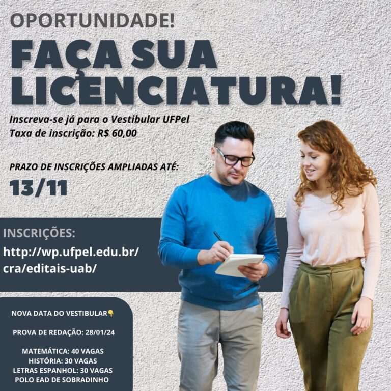 No Polo de Sobradinho, as Licenciaturas em Letras – Espanhol e História contam com 30 vagas cada, e a Licenciatura em Matemática terá 40 vagas disponíveis. As três licenciaturas são oferecidas pela UFPel, através do programa Universidade Aberta do Brasil (UAB). Informações sobre o processo seletivo estão disponíveis na página da Coordenação de Registros Acadêmicos – o CRA. Segundo a coordenadora do Polo, Nara Lopes de Souza, o Processo Seletivo prevê taxa de inscrição de R$ 60,00, a ser paga exclusivamente no Banco do Brasil, até  esta terça-feira, dia 14. Nara de Souza ressalta que eventuais dúvidas podem ser esclarecidas pelo Whatsapp número 9-9866-6554.