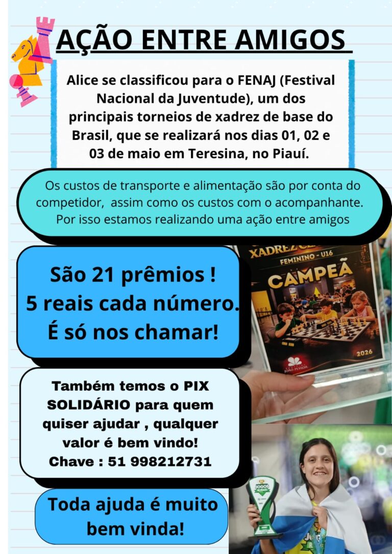 Além disso, também é possível contribuir por meio de Pix solidário, com doações de qualquer valor através da chave Pix: (51) 9-9821-2731 A iniciativa busca mobilizar a comunidade em apoio à jovem atleta, que já acumula conquistas no xadrez e agora terá a oportunidade de representar sua região em uma competição de nível nacional. Os organizadores reforçam que toda ajuda é fundamental para tornar esse sonho possível.