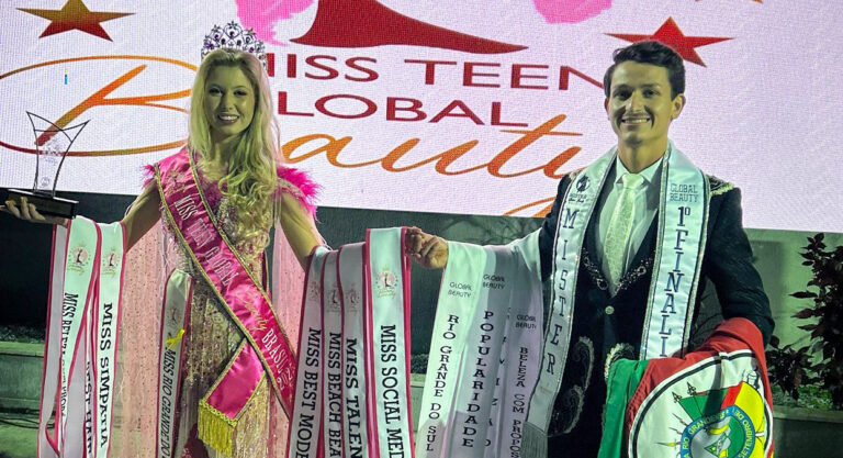 Os jovens Pyetra Sophia Teichmann, de Sobradinho, e Diego Rodrigues de Moraes, de Passa Sete, representaram o Rio Grande do Sul em um concurso nacional de beleza realizado no Rio de Janeiro, na última semana. Na final, no sábado 27, Pyetra, 17 anos, foi eleita Miss Teen Global Beauty Brasil 2025 e conquistou outros sete títulos preliminares: Miss Beleza com Propósito, Miss Best Model, Miss Simpatia, Miss Beach Beauty, Miss Talento, Miss Social Media e Miss Best Hair. Ela também foi Garota Jacuí Regional no ano de 2024, concurso promovida pelas Rádios Sobradinho AM e Jacuí FM.