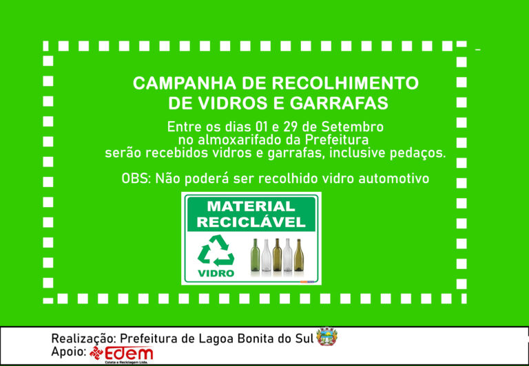 O município de Lagoa Bonita do Sul está promovendo uma campanha de recolhimento de vidros. O recebimento deste tipo de material segue até o dia 29 de setembro, no Parque de Máquinas, durante horário de expediente. Todo o material recolhido será encaminhado para a empresa Edem Coleta e Reciclagem, de Sobradinho.