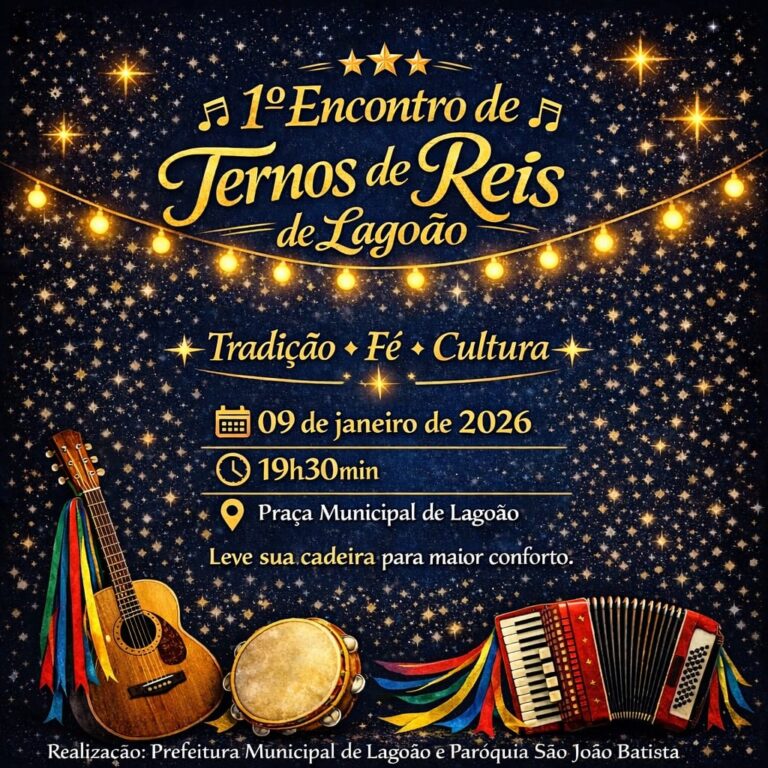 A prefeitura de Lagoão, em parceria com a Paróquia São João Batista, promove no dia 9 de janeiro o 1º Encontro de Ternos de Reis, um evento que valoriza a fé, a cultura e as tradições populares do município. A programação terá início às 19h30min, na Praça Municipal, e é aberta a toda a comunidade.
