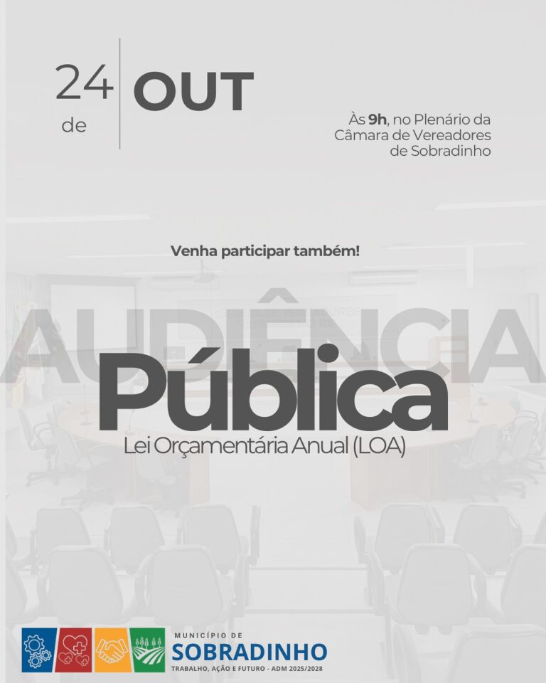 A Administração Municipal de Sobradinho promoverá Audiência Pública para apreciação e discussão da Lei Orçamentária Anual (LOA) do exercício de 2026. O encontro será nesta sexta-feira (24), às 9 horas, na Câmara de Vereadores de Sobradinho.