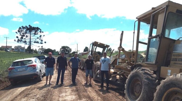 O prefeito Luiz Francisco Fagundes e o vice Leonir Francesquet, juntamente com o prefeito de Passa Sete, Mauricio Ruoso, e seu vice Gerson Lopes, estiveram ontem acompanhando os trabalhos de recuperação do trecho da estrada de Travessa Karnopp, que liga os dois municípios.
