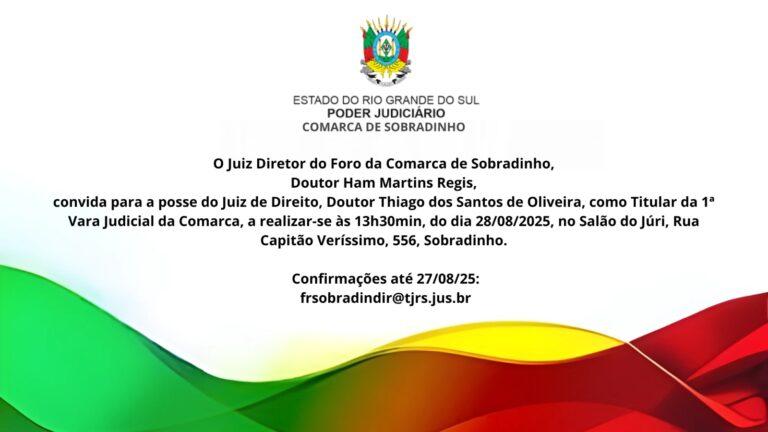 A Comarca de Sobradinho contará com um novo juiz titular na 1ª Vara Judicial. Conforme o Diretor do Foro, Juiz Ham Martins Regis, o magistrado Thiago dos Santos Oliveira assumirá oficialmente a função.