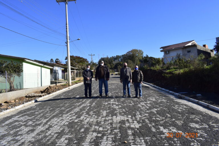 O prefeito Armando Mayerhofer, o vice-prfeito Ivan Trevisan, e os secretários municipais de Obras e Serviços Urbanos, Olandir Bernardy, e de Finanças e Planejamento, Nilo Wietzke, vistoriaram as obras de pavimentação no município. Na ocasião visitaram as obras da Rua Valdemar Stecker, na entrada para Linha Brasileira, onde serão pavimentados 2.420,55m², e mais 664,55m² de passeio público (calçadas), um investimento de R$ 241.178,73.