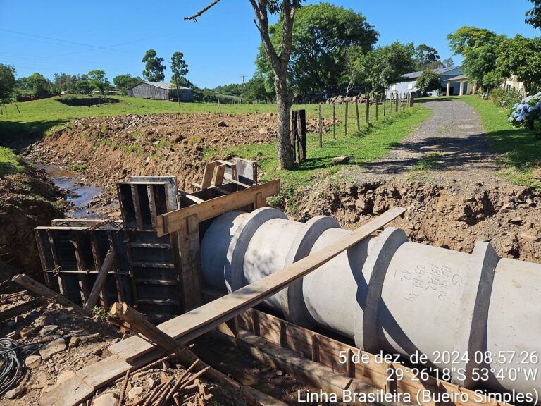 A Administração Municipal de Sobraddinho segue investindo em infraestrutura com a construção de um bueiro simples em Linha Brasileira, no interior do município. Segundo o engenheiro responsável, Dieisson Bridi, a montagem das formas está em fase final, e a concretagem das bocas está prevista para ocorrer ainda nesta quinta-feira.