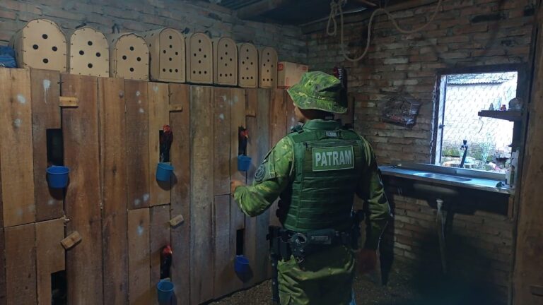 Durante a fiscalização, uma testemunha identificou o dono da propriedade, que não estava presente. Um funcionário acompanhou a equipe, mas não apresentou autorização para a intervenção na área. Além do desmatamento, os policiais encontraram indícios de prática de rinha de galos no local. Foram apreendidos 60 galos indianos confinados, alguns com sinais de mutilação, além de transportadores, biqueiras, medicamentos, esporas artificiais, uma balança digital e até uma arena de combate montada. Diante das irregularidades, foi lavrado auto de infração ambiental.