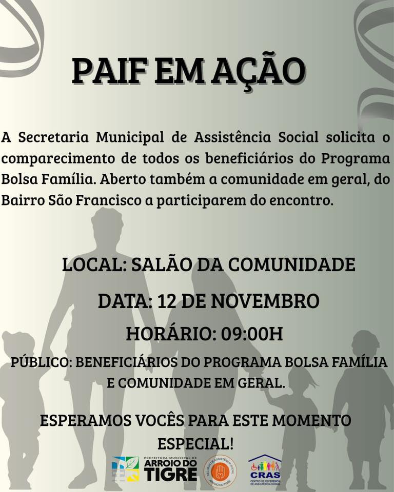 A Secretaria Municipal de Assistência Social de Arroio do Tigre convida todos os beneficiários do Programa Bolsa Família e a comunidade em geral para participarem dos encontros do PAIF em Ação, que serão realizados nesta quarta-feira (12). Pela manhã, o encontro será no Bairro São Francisco, a partir das 9 horas, no salão comunitário.