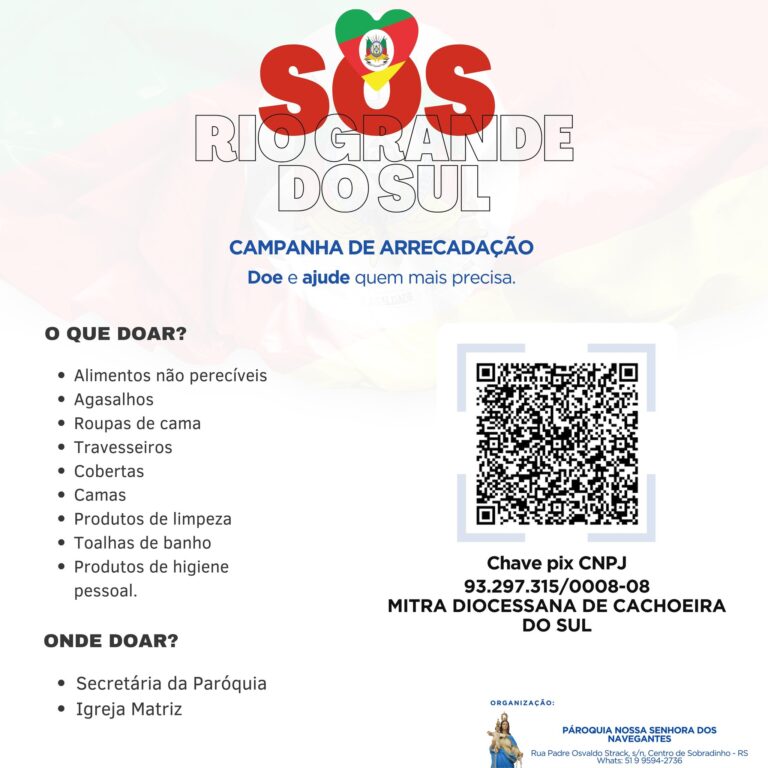 Além disso, quem desejar também pode fazer doações em dinheiro através do pix da paróquia. Os pontos de entrega são o Salão Paroquial, a Secretaria da paróquia durante o horário de expediente e na Igreja Matriz, inclusive aos finais de semana.