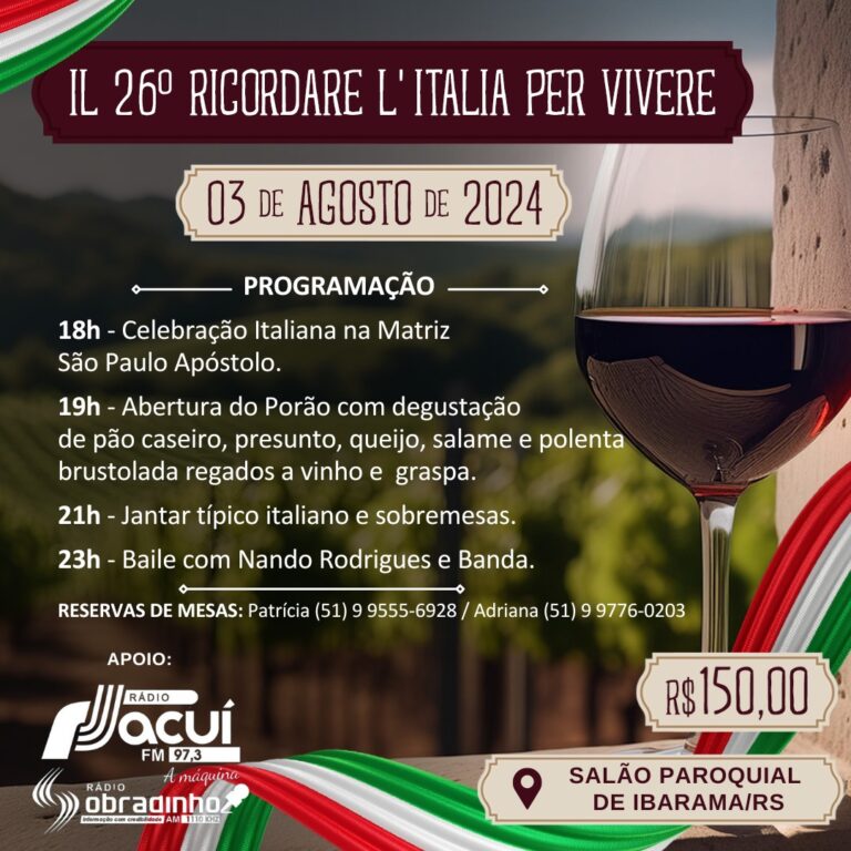 Ocorre hoje em Ibarama o 26º Ricordare L’Italia Per Vivere, promovido pela Paróquia São Paulo Apóstolo. A programação inicia às 18h com celebração italiana na Matriz. Logo após ocorre a abertura do porão, no Salão Paroquial Católico, com degustação de pão caseiro, presunto, queijo, salame e polenta brustolada, regados a vinho e graspa. O jantar, com variado cardápio típico italiano, será servido às 21h. Após o jantar haverá baile animado por Nando Rodrigues e Banda.