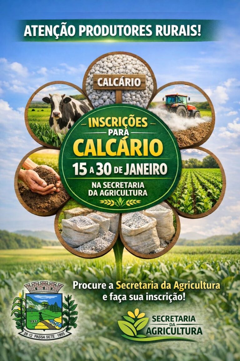 A Secretaria Municipal da Agricultura de Passa Sete está recebendo, a partir desta quinta-feira (15) até o dia 30 de janeiro, as inscrições para pedidos de calcário destinados aos produtores rurais do município. A ação tem como objetivo auxiliar na correção do solo e no fortalecimento da produção agrícola. Os produtores beneficiados deverão arcar apenas com o custo da carga de calcário, enquanto o frete será custeado integralmente pela Prefeitura de Passa Sete.