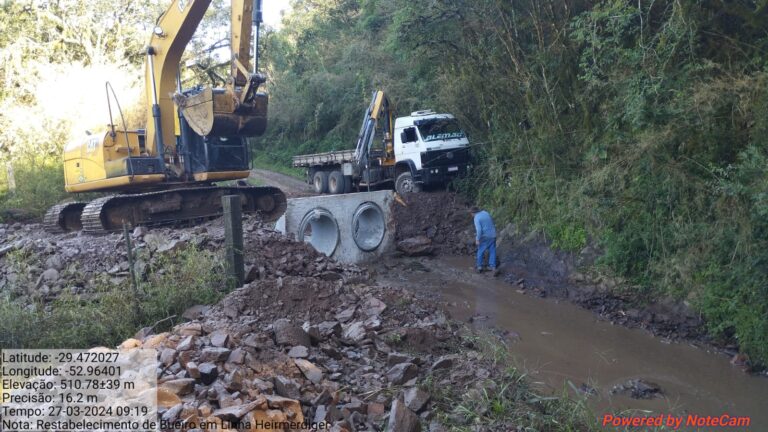 A Secretaria Municipal de Obras de Passa Sete iniciou nesta quarta-feira (27) a construção de um bueiro/galeria em Linha Heimerdinger próximo a propriedade da família Vargas. Esta obra segue o cronograma de obras da Defesa Civil Municipal, realizada com recursos oriundos da Defesa Civil Nacional em virtude do decreto da situação de emergência de julho de 2023.