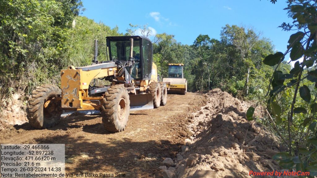 Também por meio da Defesa Civil Municipal e Secretarias de Obras e Agricultura, está sendo feito, durante essa semana, o restabelecimento da estrada geral de Baixo Passa Sete, com o alargamento, colocação de bueiros e britagem. Esse trabalho tem por objetivo melhorar as condições de trafegabilidade para a população do município, e segue o cronograma de serviços que serão feitos em todas as localidades do interior de Passa Sete.