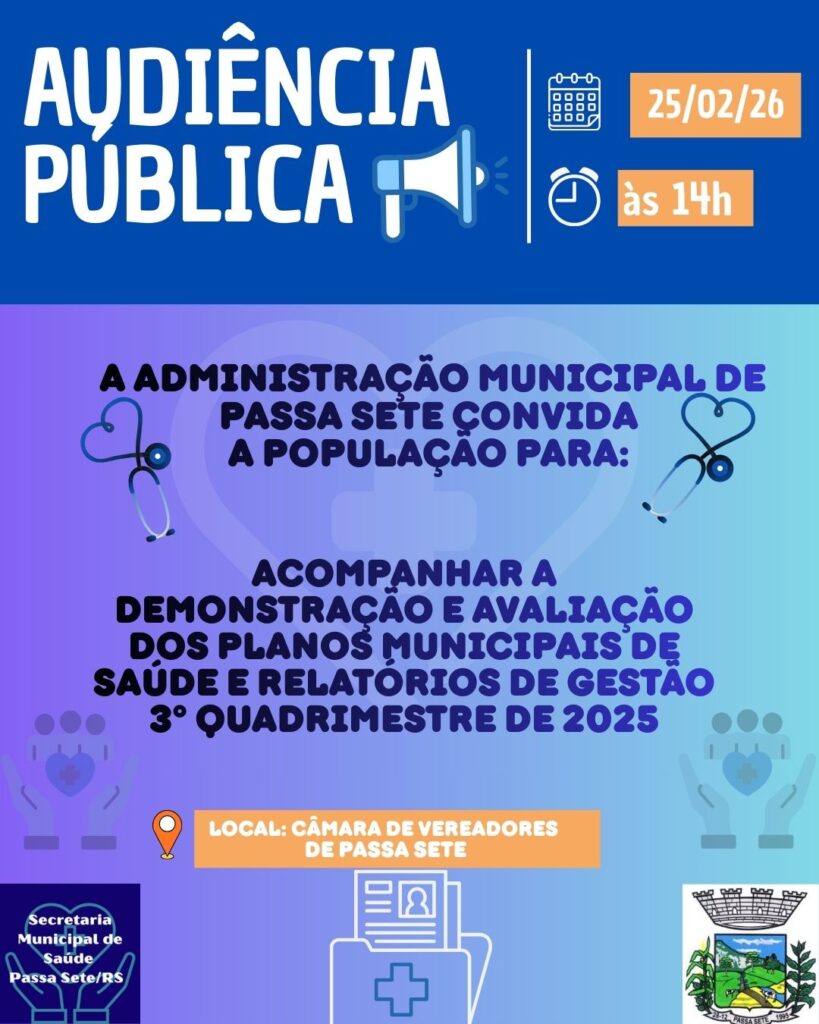 A Administração Municipal de Passa Sete promove uma Audiência Pública na área da saúde. O encontro será nesta quarta-feira (25), logo mais às 14h, na Câmara de Vereadores de Passa Sete. Na ocasião, será feita a demonstração e avaliação dos Planos Municipais de Saúde, bem como a apresentação dos Relatórios de Gestão referentes ao 3º quadrimestre de 2025.