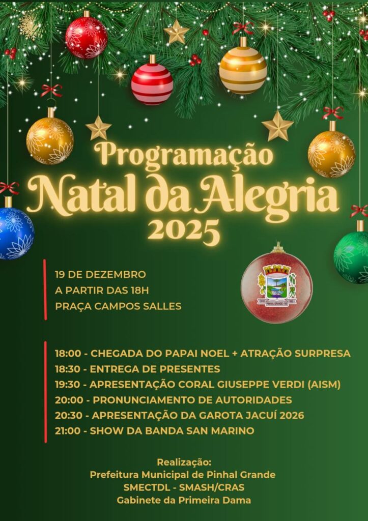 O Natal da Alegria 2025 é uma realização da Prefeitura Municipal de Pinhal Grande, por meio das Secretarias de Educação e Assistência Social, além do Gabinete da Primeira-Dama, reforçando o espírito natalino, a integração comunitária e a valorização cultural. A organização lembra que toda a programação é gratuita e orienta as famílias a levarem cadeiras para maior conforto durante o evento.