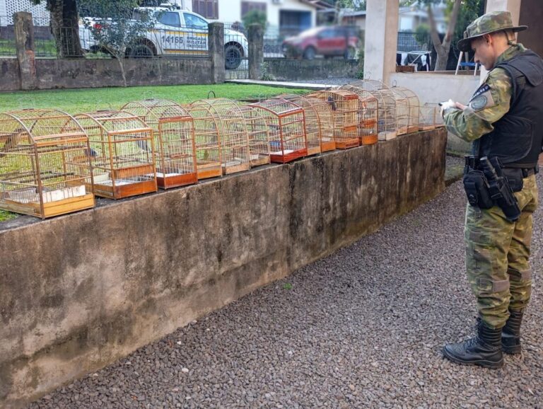 A Guarnição de Serviço do 2º Grupo de Polícia Militar Ambiental de Rio Pardo, em ações de Polícia de Proteção Ambiental, realizou Operação Força-Verde Passeriformes nessa quinta-feira (1º), no município de Venâncio Aires. Foram inspecionadas duas residências acerca de denúncias de pássaros silvestres mantidos em cativeiro. Durante a ação foram apreendidos 16 pássaros silvestres e 16 gaiolas, encaminhados ao órgão ambiental municipal para inspeção e correta destinação. No primeiro local fiscalizado foram flagradas duas gaiolas contendo um exemplar de Trinca-ferro (Saltator similis) em cada.