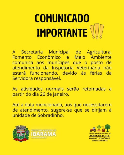 A Administração Municipal de Ibarama orienta que os produtores e demais usuários se organizem com antecedência e agradece a compreensão da comunidade durante o período de suspensão temporária dos atendimentos.