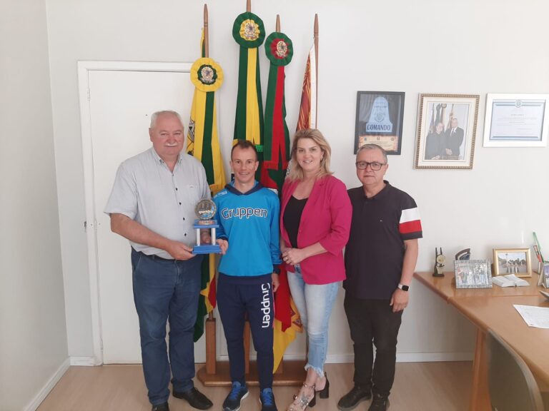 O prefeito de Sobradinho, Armando Mayerhofer; o vice-prefeito, Ivan Trevisan; e a secretária municipal da Educação, Cultura, Turismo e Desporto, Cleura Minetto, receberam na manhã desta terça-feira (29), o atleta Anderson Hunter, para celebrar sua vitória na Maratona de Bento Gonçalves. Hunter conquistou o 1º lugar na categoria 30 a 34 anos e o 6º lugar geral.