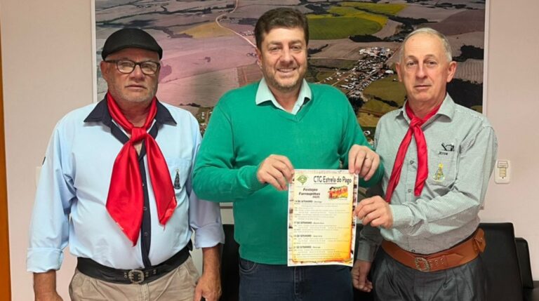 O prefeito Alexander Castilhos, recebeu em seu gabinete a visita do patrão do CTG Estrela do Pago, Jorce Nogueira, e do capataz Cleonei Maidana. Na ocasião, foi entregue ao gestor municipal o convite oficial para os Festejos Farroupilhas 2025. A programação terá início no dia 14 de setembro, com o acendimento da Chama Crioula, seguido de Missa Crioula, almoço, apresentação da invernada mirim do Grupo Municipal Estrelas da Tradição e tarde dançante com o grupo Novo Sentido.