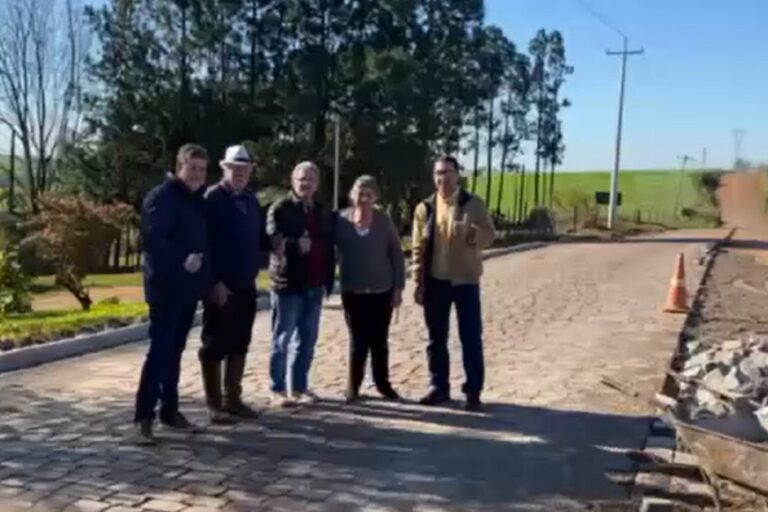 O prefeito de Estrela Velha, Alexander Castilhos, e o vice-prefeito, Gilmar Steffanello, estiveram no distrito de Rincão da Estrela, vistoriando os trabalhos na obra de pavimentação da localidade. Os gestores estiveram acompanhados do vereador, Carlos José Somavilla, e dos moradores, Vilmar Ferreira e Santa Tereza Maciel Ferreira.