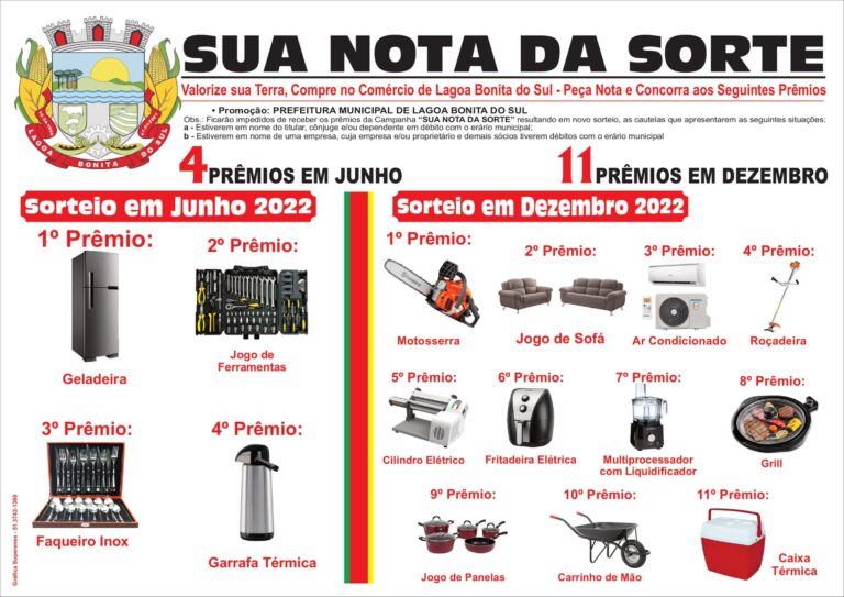 A prefeitura de Lagoa Bonita do Sul iniciou a troca de notas fiscais por cupons do programa Sua Nota da Sorte 2022. A Campanha tem o slogan, “Gaste aqui, gaste perto, pois o retorno é certo”. Podem concorrer os consumidores, usuários de serviços, produtores rurais, contribuintes municipais e pessoas jurídicas. Os cupons podem ser trocadas no Setor de Blocos na prefeitura. Consumidores, usuários de serviços e contribuintes municipais terão direito a uma cautela a cada R$100,00 em notas fiscais. Pessoas jurídicas, a cada R$250,00 em notas fiscais, e produtores rurais terão direito a uma cautela a cada R$500,00 em notas emitidas no Bloco de Produtor.