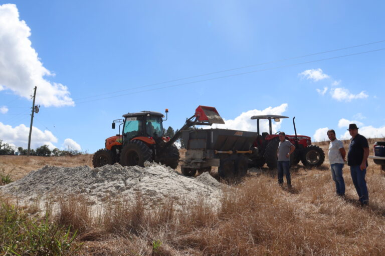 O prefeito Luiz Francisco Fagundes; o diretor de Agricultura, Fabiano Colombelli, e o servidor Nei Moraes estiveram acompanhando os trabalhos na localidade de Linha Alta Fundos. Segundo o prefeito, nesse ano foram investidos com recursos próprios do município, R$ 200 mil reais, na compra de calcário e adubo para os agricultores, sendo que cada produtor pagou somente o frete.
