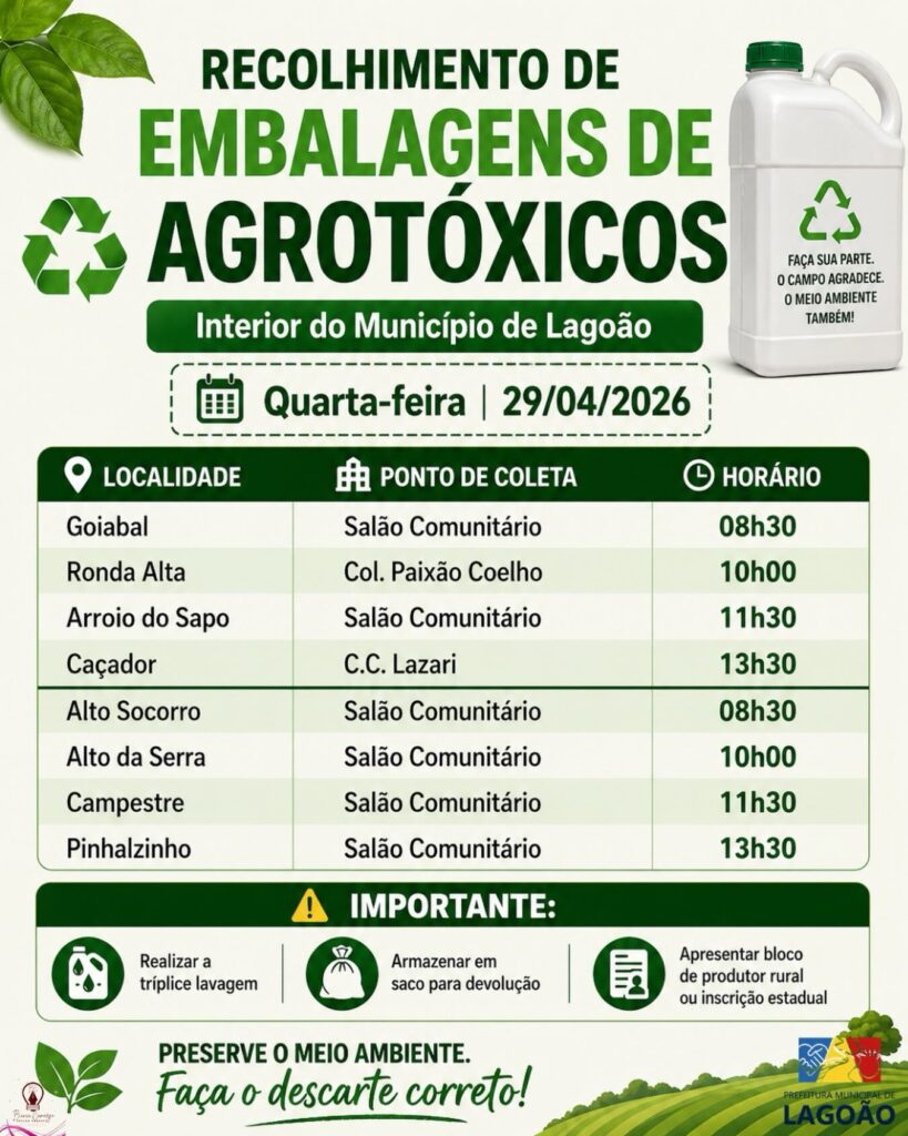 Os pontos de coleta e horários serão os seguintes: em Goiabal, às 8h30; em Ronda Alta, às 10h; em Arroio do Sapo, às 11h30; em Caçador, às 13h30; em Alto Socorro, às 8h30; em Alto da Serra, às 10h; em Campestre, às 11h30; e em Pinhalzinho, às 13h30. A Administração Municipal de Lagoão destaca que os produtores rurais deve fazer a tríplice lavagem das embalagens, armazená-las em sacos apropriados para devolução e apresentar o bloco de produtor rural ou inscrição estadual no momento da entrega.