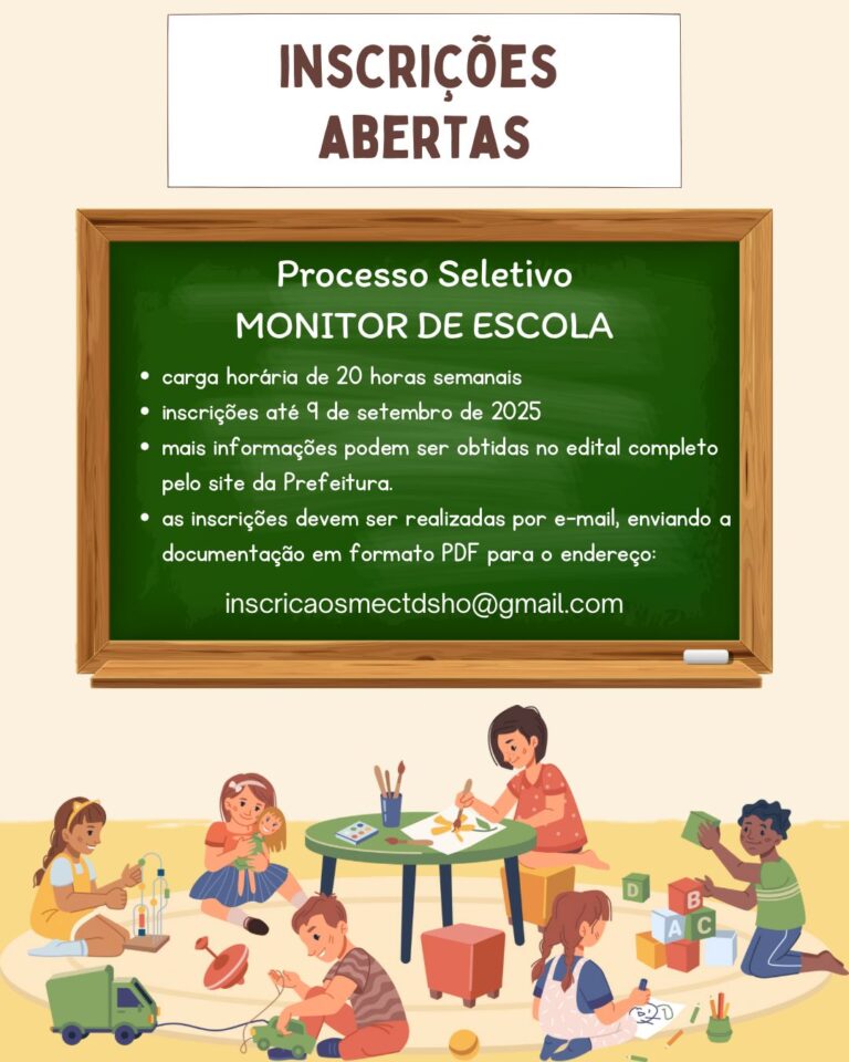 A Secretaria Municipal de Educação, Cultura, Turismo e Desporto está recebendo inscrições para o Processo Seletivo destinado à contratação de Monitor de Escola – 20 horas semanais. As inscrições serão recebidas exclusivamente por meio eletrônico até a próxima terça-feira, dia 9 de setembro, através do e-mail: inscricaosmectdsho@gmail.com.