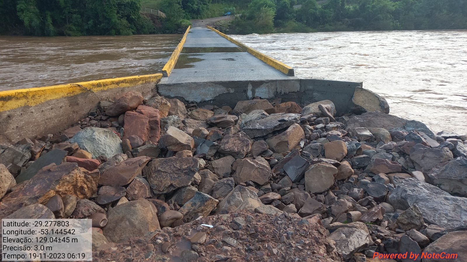 Entre os locais atingidos está a ponte sobre o Rio Jacuizinho, na divisa com Arroio do Tigre. As cabeceiras da estrutura foram levadas pela água. A ponte está interditada. Por conta disso, o acesso Itaúba deve ser feito pela cidade de Estrela Velha. O prefeito de Segredo, Valdir Rodrigues também anunciou que vai decretar situação de emergência no município.