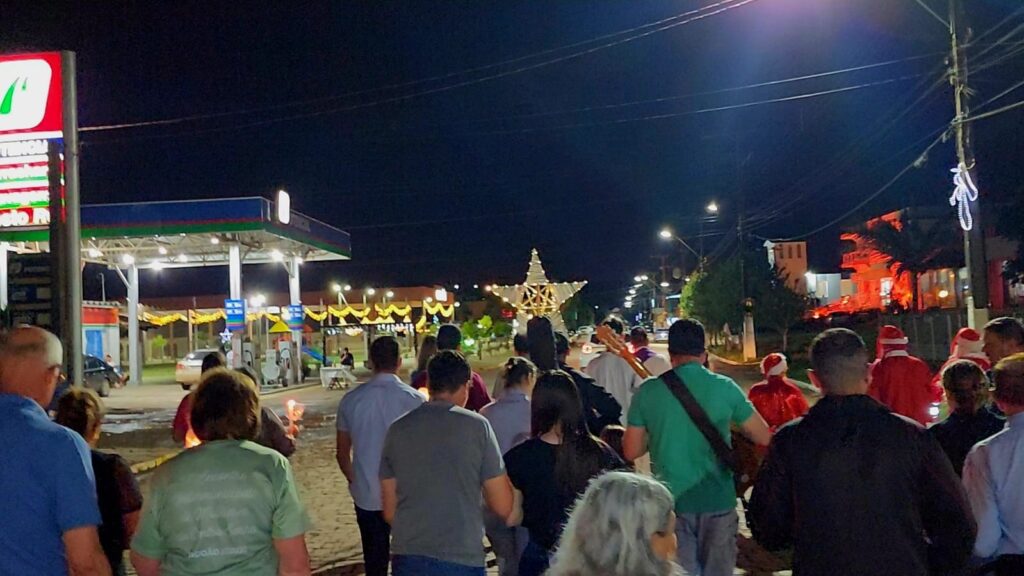 A concentração começou às 20h em frente à Capela Santo Antônio, que será restaurada em 2026. O cortejo seguiu pelo centro, passando pela Escola Estadual, Hospital São João Batista e praça municipal, enquanto moradores e comerciantes prepararam altares iluminados em frente às casas, simbolizando a acolhida da luz do Natal.