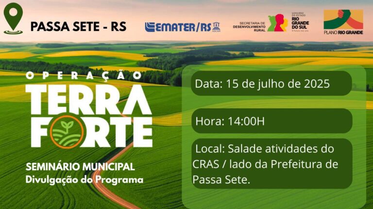 O Programa de Recuperação Socioprodutiva e Ambiental e Incremento da Resiliência Climática da Agricultura Familiar Gaúcha – Operação Terra Forte – será tema de seminário em Passa Sete. O evento inicia logo mais às 14 horas na sala de atividades do CRAS, ao lado do centro administrativo municipal. Nesta quarta-feira (16), o mesmo seminário ocorre em Ibarama, às 8 horas e 30 minutos, no Centro Municipal de Eventos. Já na próxima sexta-feira (18), o Seminário será em Sobradinho, a partir das 14 horas, na Câmara de Vereadores.