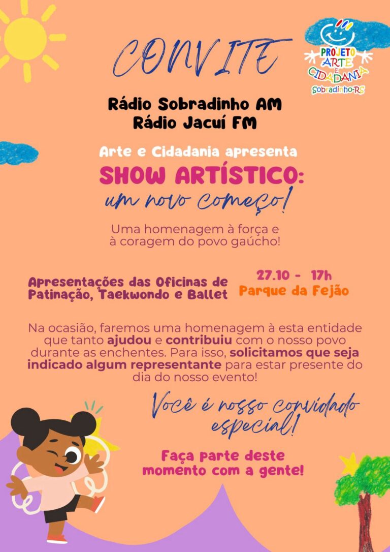 Neste domingo, dia 27, a cidade de Sobradinho receberá mais uma edição do tradicional Show Artístico promovido pelo Projeto Arte e Cidadania. O evento, que celebra a força e a coragem do povo gaúcho, acontecerá no Ginásio Antônio Dors, localizado no Parque da Fejão, a partir das 17h. A programação contará com apresentações especiais dos alunos das oficinas de patinação, taekwondo e ballet, que prometem encantar o público com suas performances.