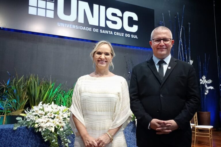 Rafael Frederico Henn e Andréia Rosane de Moura Valim foram empossados como reitor e vice da Universidade de Santa Cruz do Sul (Unisc) para a gestão 2022/2025. A cerimônia ocorreu na tarde desta terça-feira (21) no Auditório Central da instituição e contou com presença de diversas autoridades. Concorrendo em chapa única, os dois foram eleitos em novembro deste ano com 96,42% dos votos de docentes, estudantes de graduação e pós-graduação, técnicos administrativos e associados efetivos da Assembleia Geral Comunitária da Apesc.