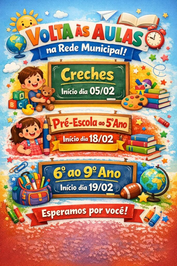 Para os alunos da pré-escola ao 5º ano, as aulas começam em 18 de fevereiro, no turno da tarde. Já os estudantes do 6º ao 9º ano retornam no dia 19 de fevereiro, no turno da manhã. A Secretaria Municipal de Educação reforça a importância da presença dos alunos desde o primeiro dia, contribuindo para um ano letivo produtivo e cheio de aprendizados.